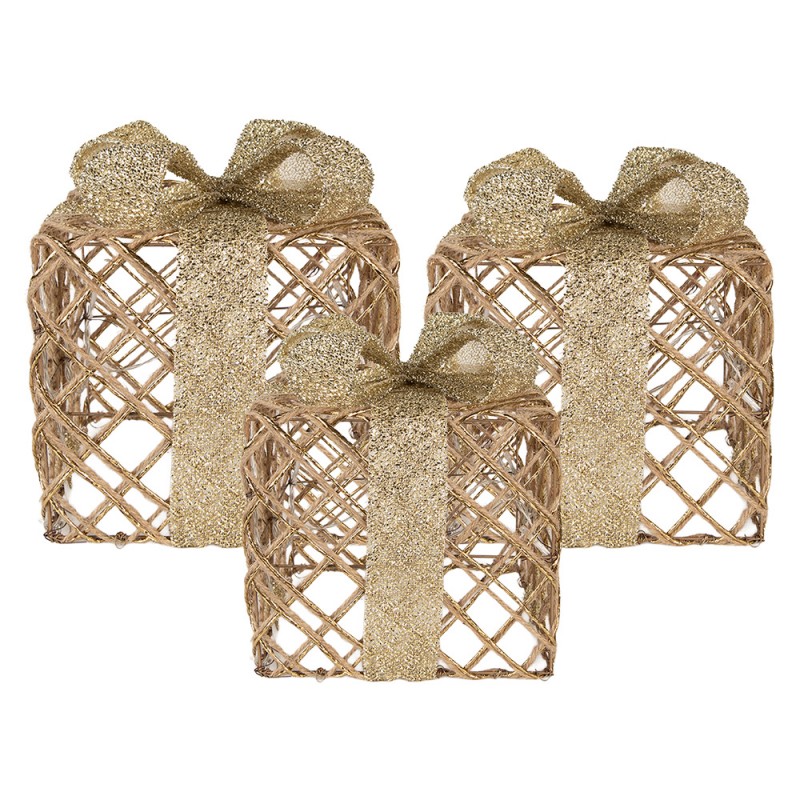 Rozjasnite si interiér našou štýlovou zlatou LED dekoráciou! Táto sada troch krásne navrhnutých lámp (25x25x30, 20x20x24, 15x15x17 cm) dodá každej miestnosti teplú atmosféru. Ideálne ako darček alebo pre vás samých. Funguje na 6 AA batériách, batérie nie sú súčasťou balenia.